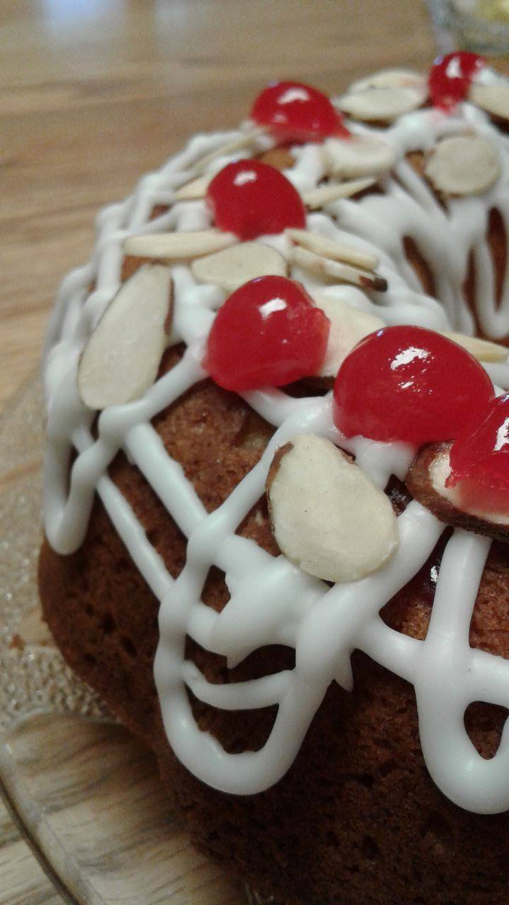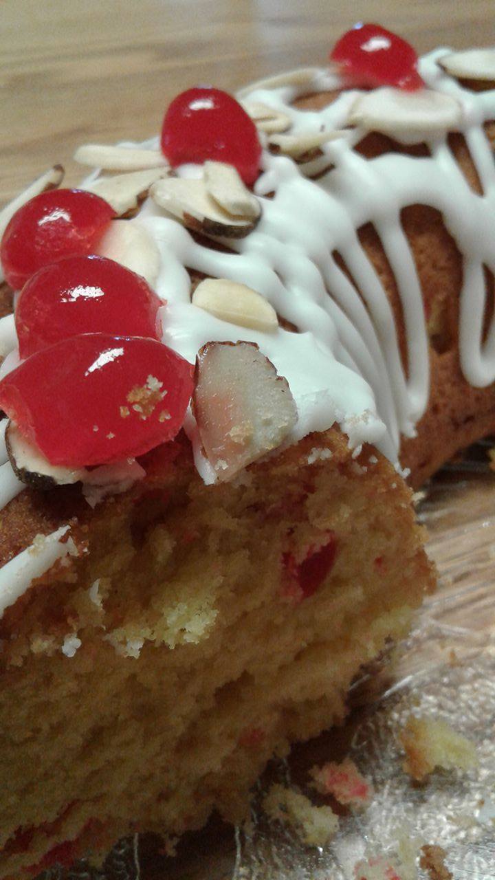 We couldn’t get glacé cherries this time of year since they are considered seasonal here so we used maraschino cherries.